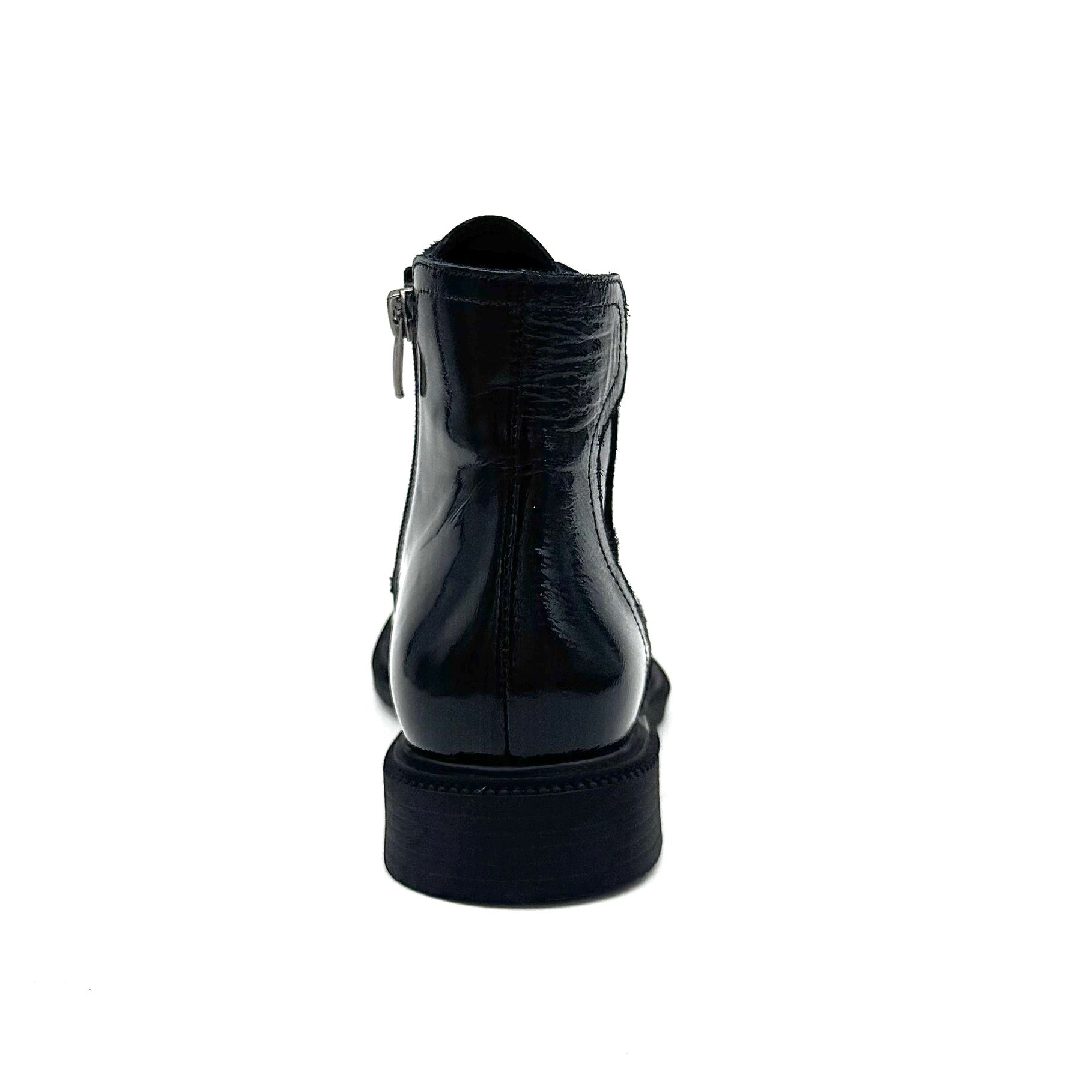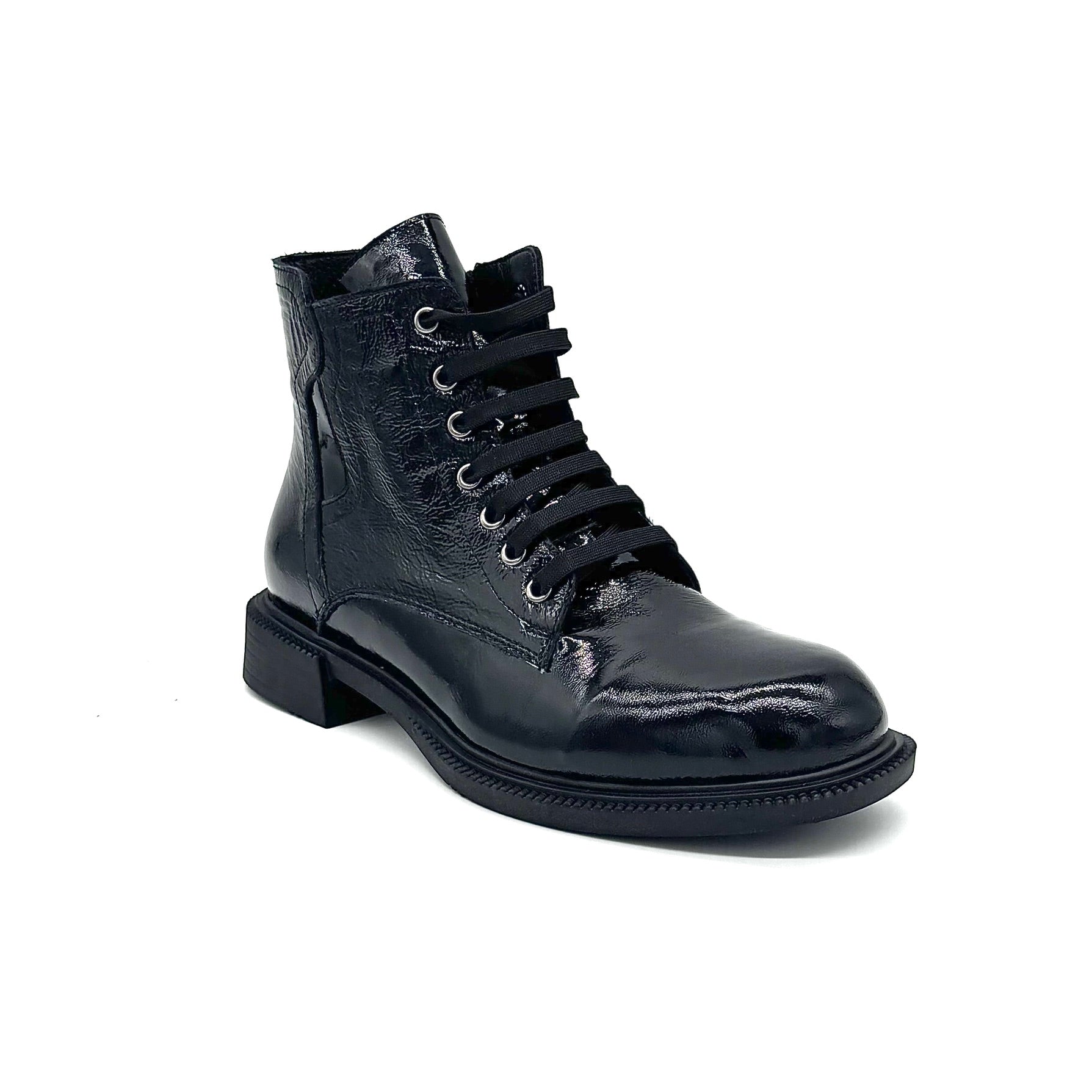 A sleek and modern ankle boot designed for everyday sophistication. Crafted from premium black leather with a subtle glossy texture, this Bonavi style combines timeless craftsmanship with a bold, contemporary edge. The lace-up front offers a secure fit, while the durable rubber sole provides all-day comfort and stability. Perfect for pairing with jeans, skirts, or tailored looks, this boot transitions seamlessly from day to night.
