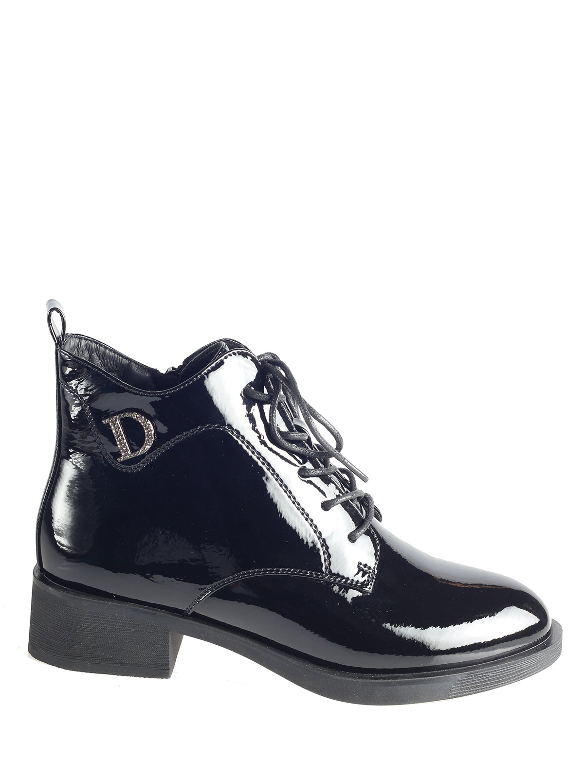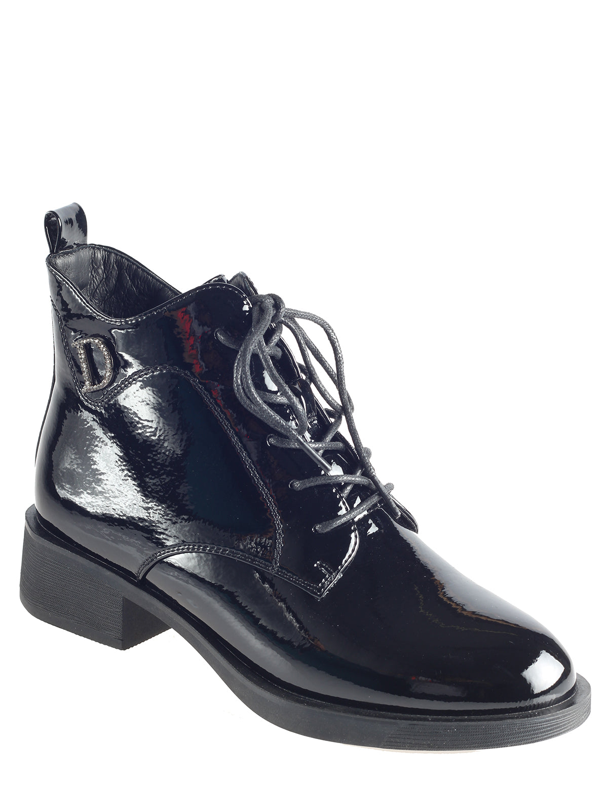 Black patent leather bootie with laces and soft instep. Inner and outer are leather; Bottom is rubber.