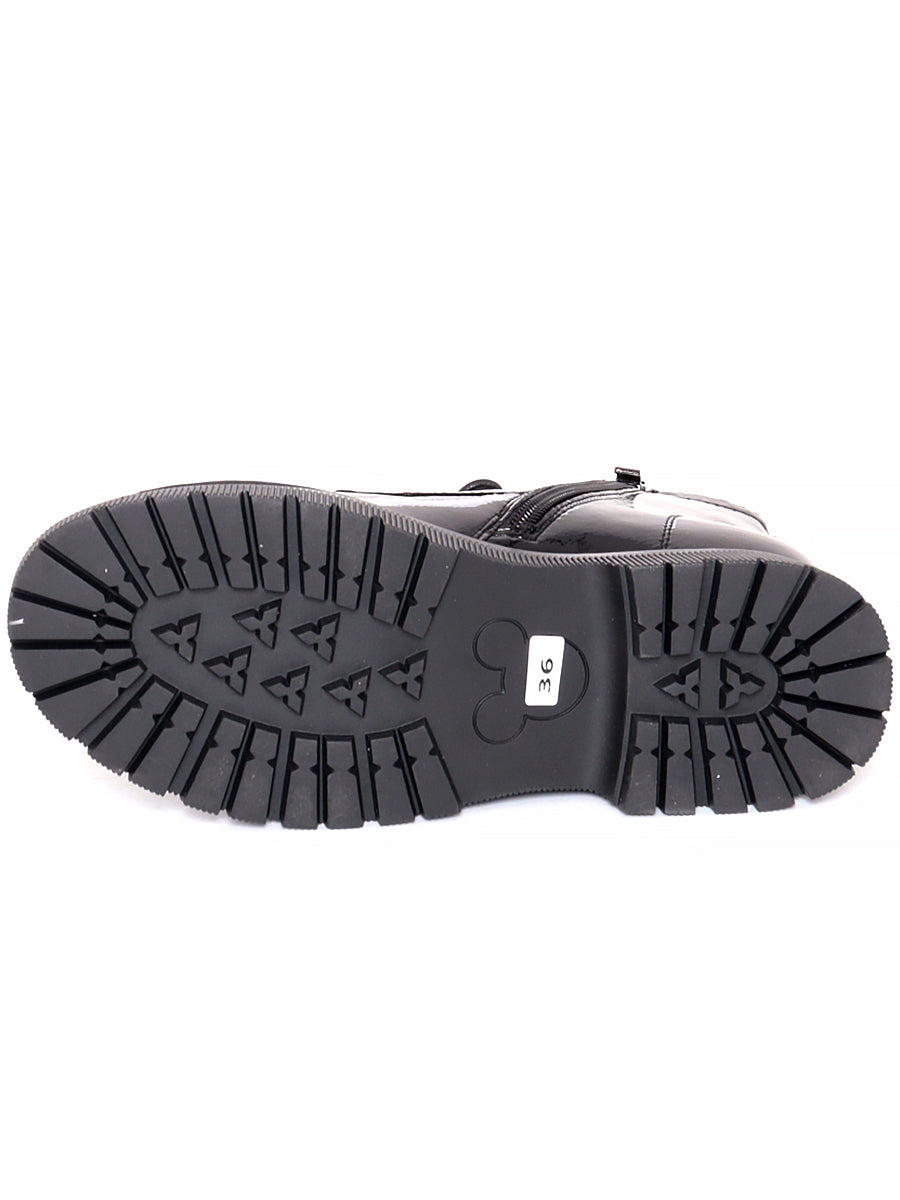 Black patten leather bootie with laces and soft insole. Inner and outer are leather; Bottoms are rubber.