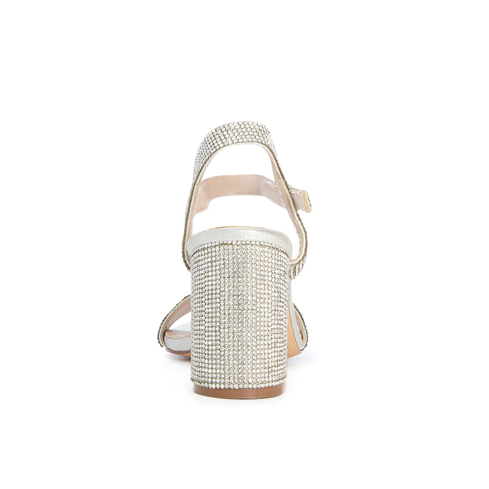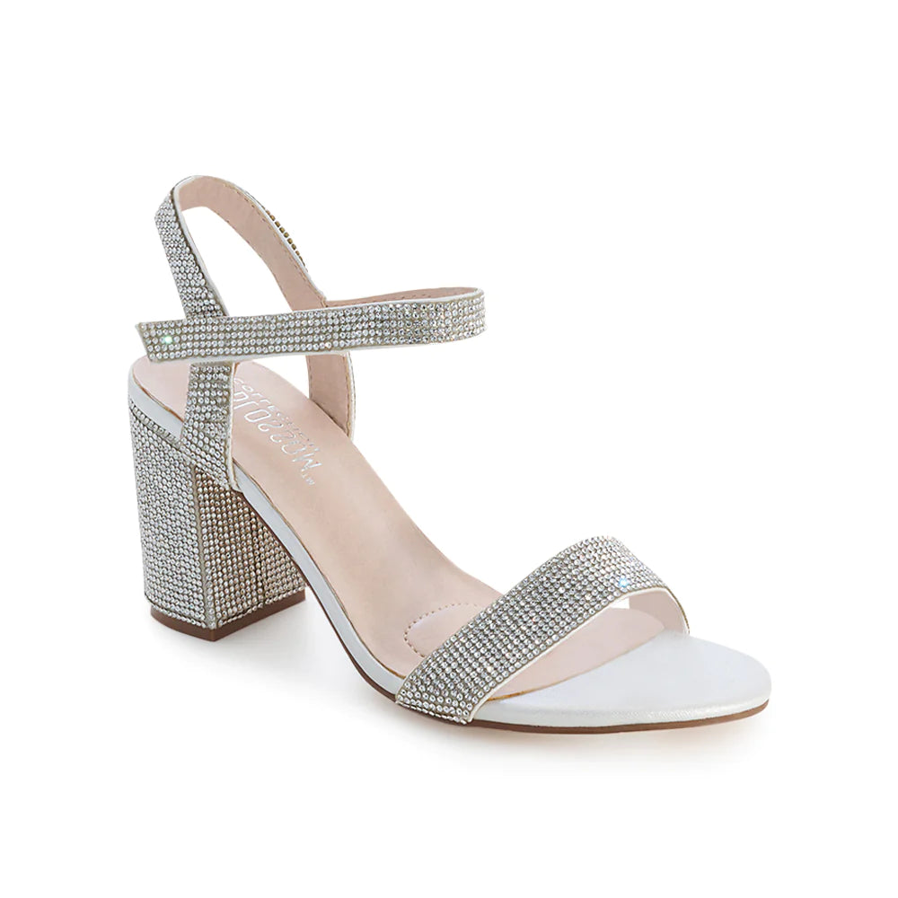 Ankle strap open toe mid block heel. Crafted with shimmer material and featuring velcro straps and cushioned insole for added support.