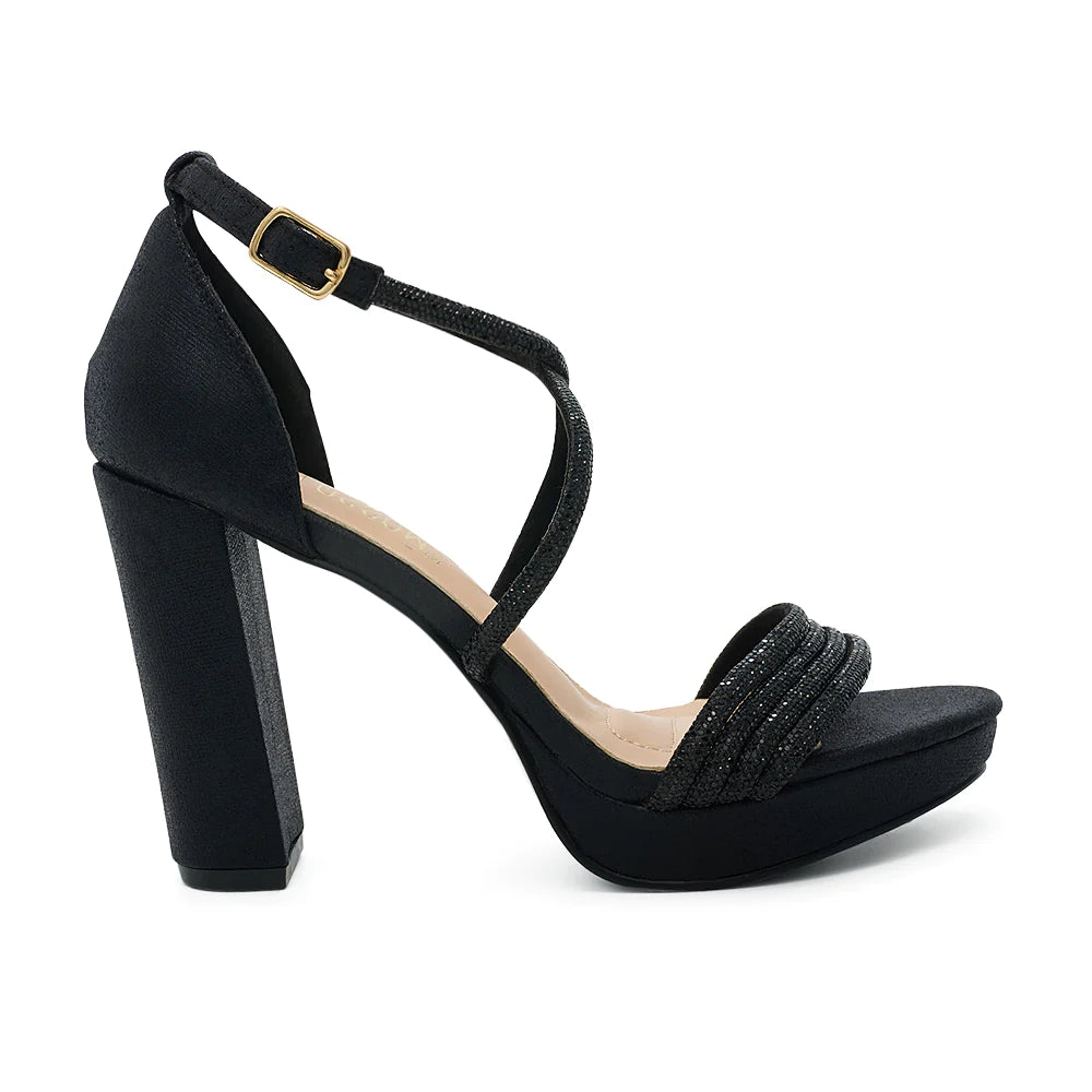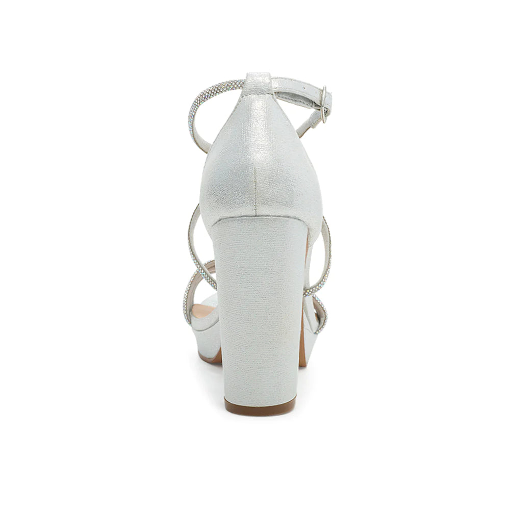 Open toe high block heel; These shimmer heels feature adjustable buckle straps and cushioned insole support for all-day comfort.