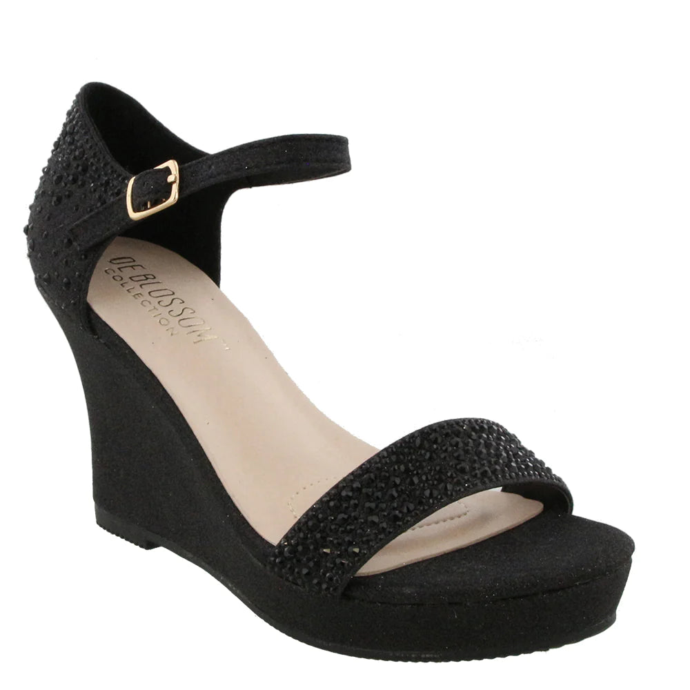 Open toe wedge heels. Crafted from shimmer material with adjustable buckle straps and cushioned insole support, these heels are perfect for any occasion.