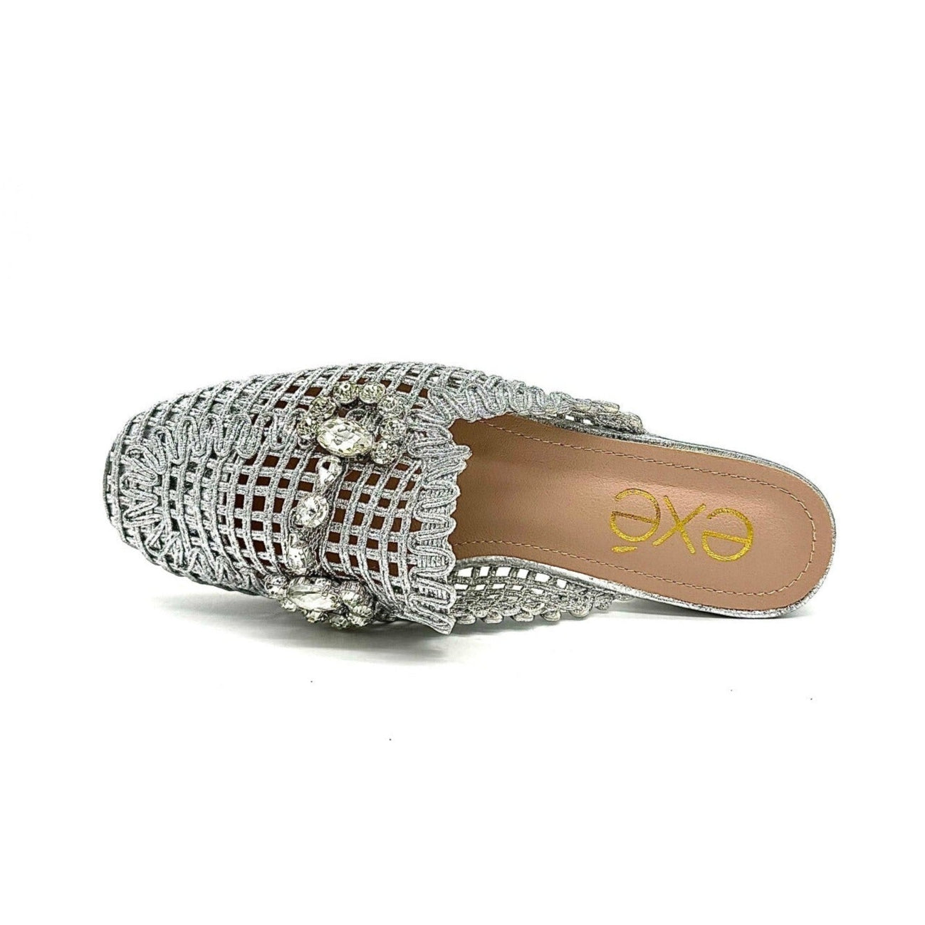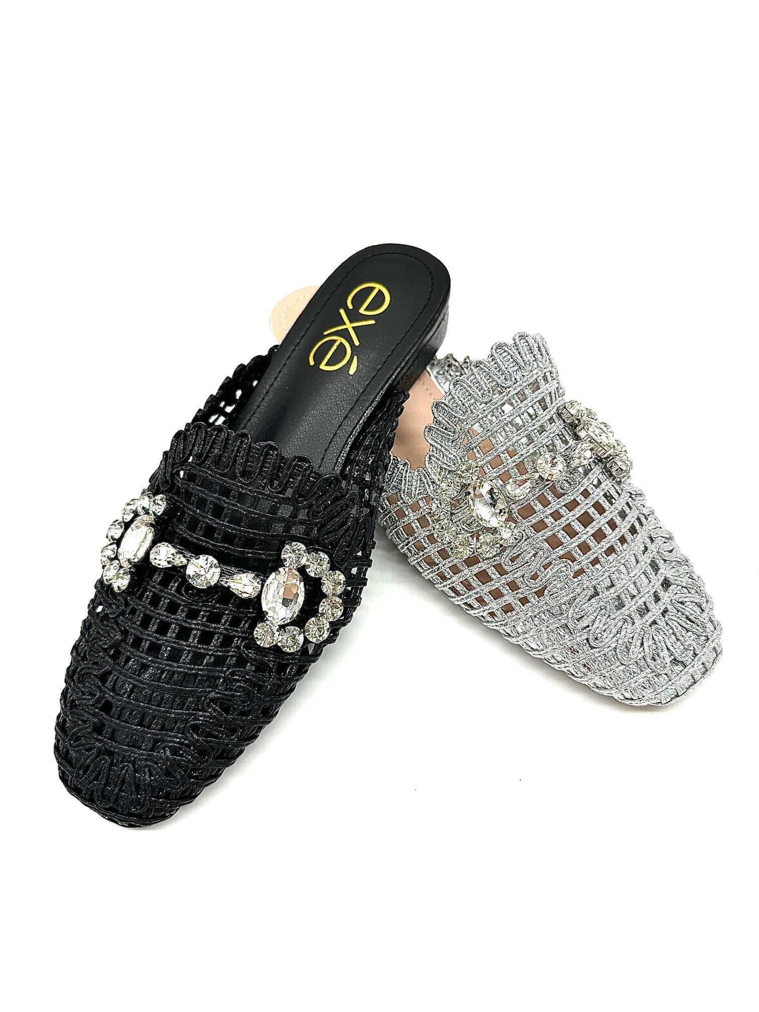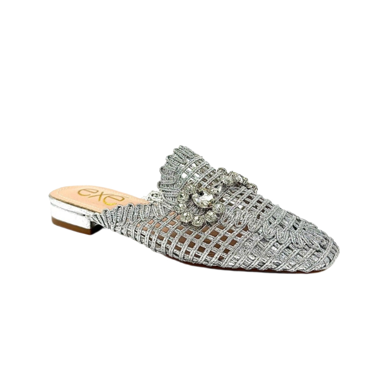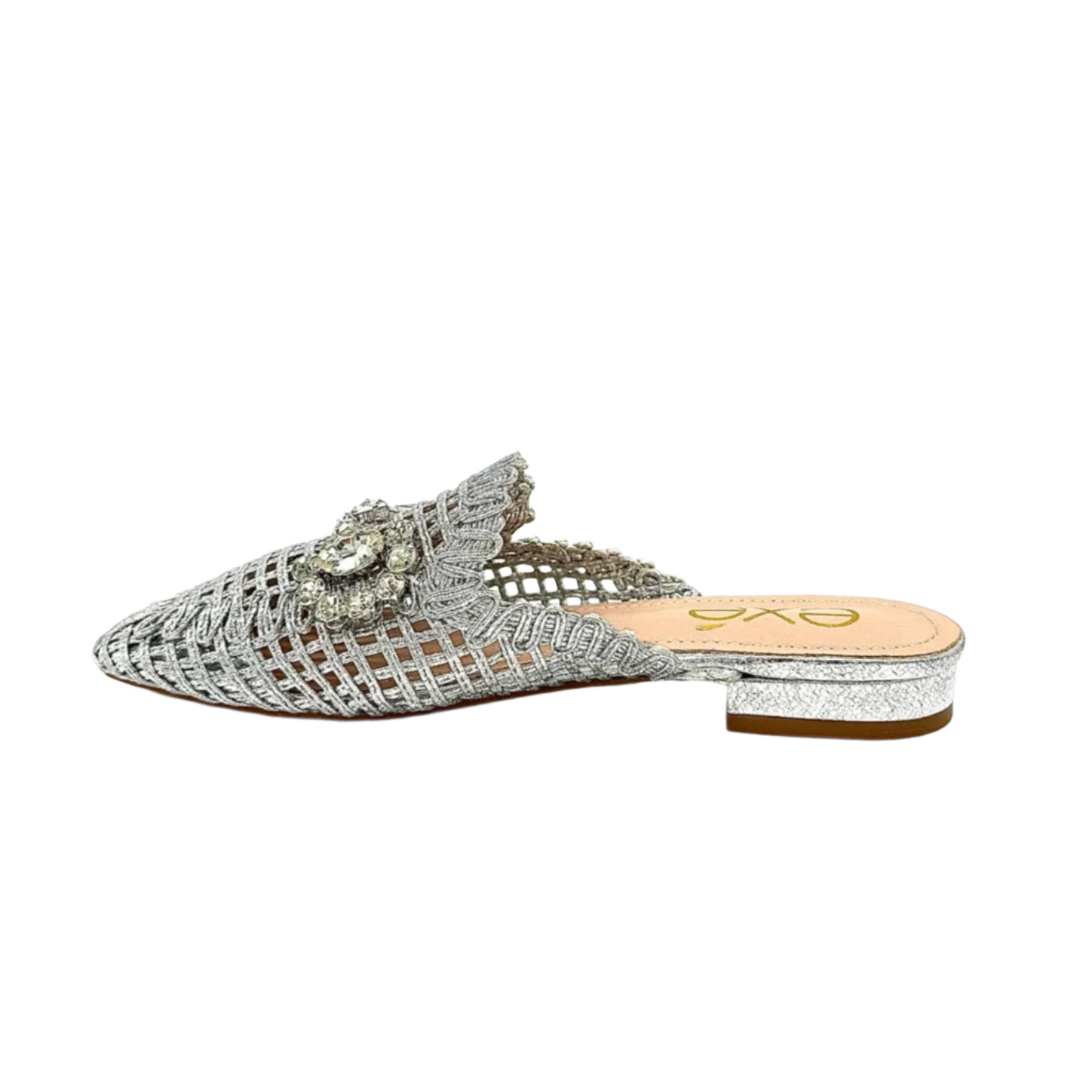 Add instant glamour to your look with the EXE 23008-A1 — a statement woven mule that blends elegance with everyday comfort. Featuring a glimmering lattice texture and topped with a crystal flower embellishment, this slip-on is designed to sparkle from every angle. Its lightly cushioned insole and low heel make it as comfortable as it is chic. Perfect for weddings, parties, or a night out, this mule brings effortless sophistication to any outfit.