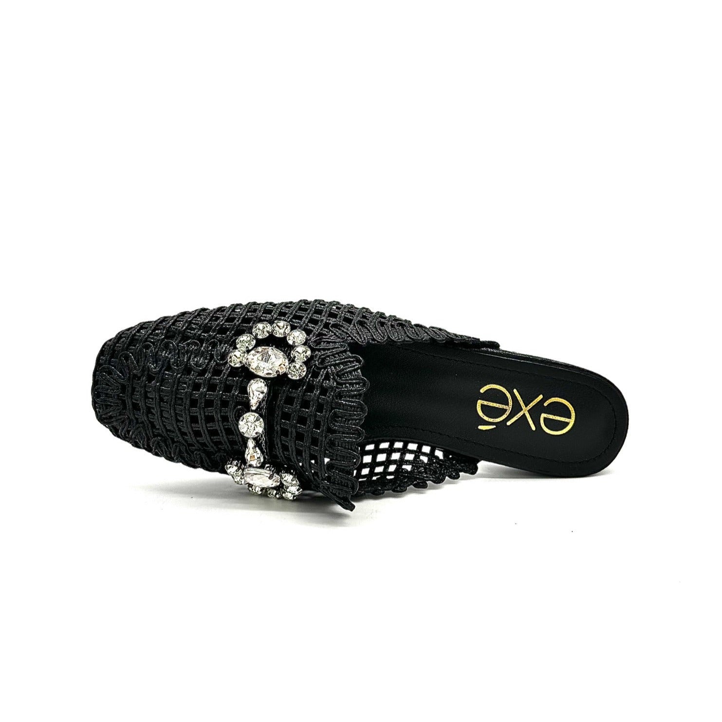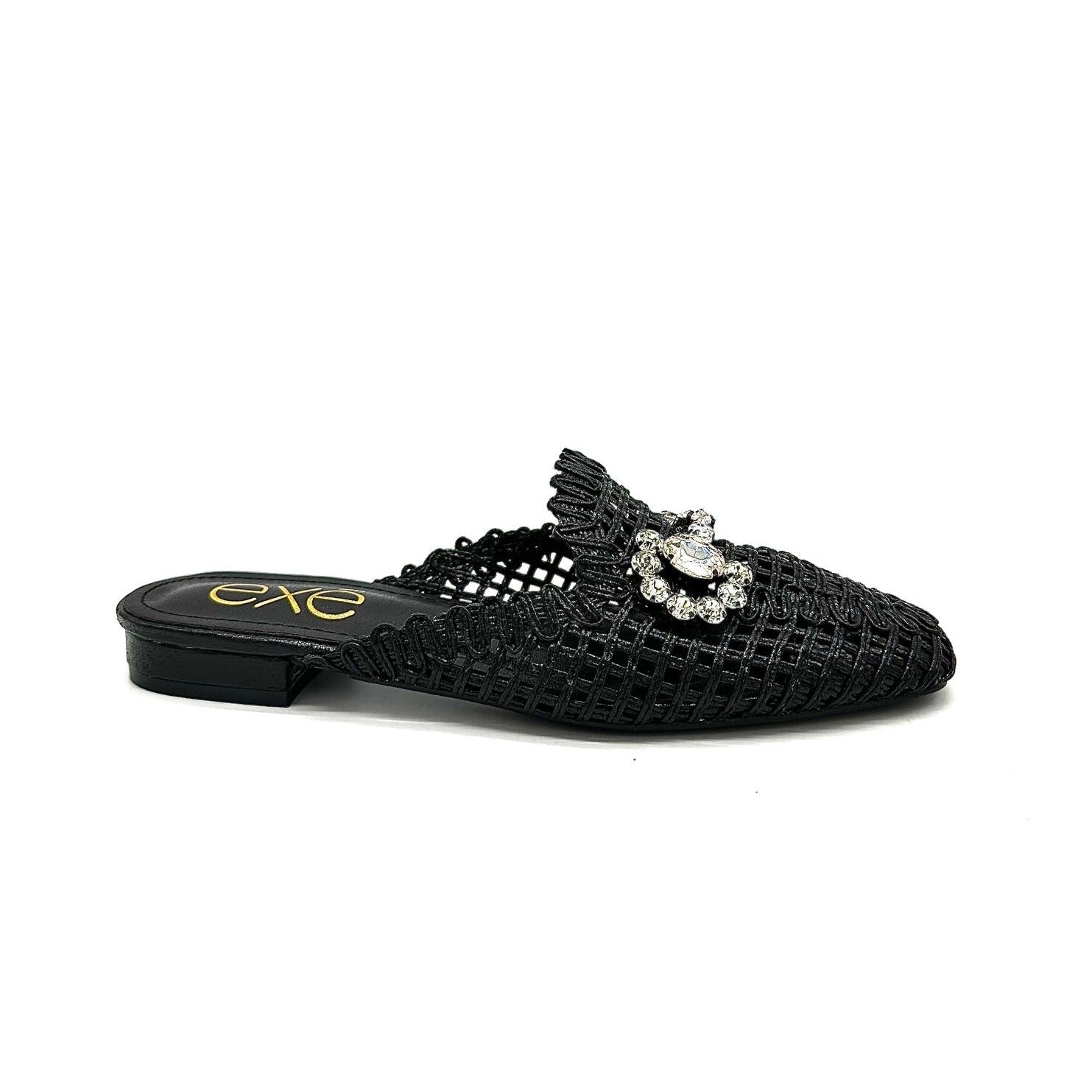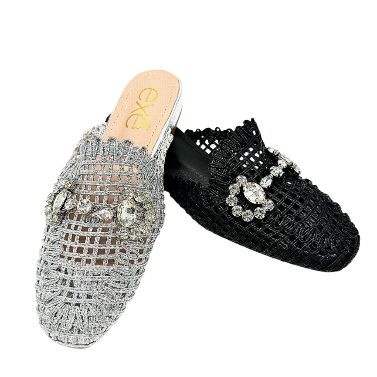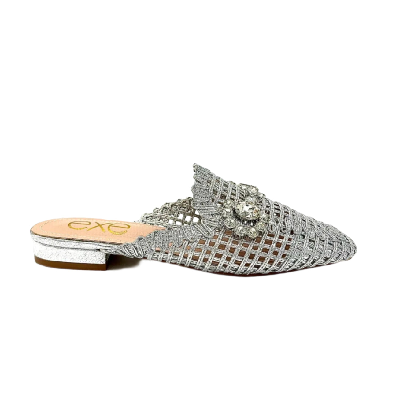 Add instant glamour to your look with the EXE 23008-A1 — a statement woven mule that blends elegance with everyday comfort. Featuring a glimmering lattice texture and topped with a crystal flower embellishment, this slip-on is designed to sparkle from every angle. Its lightly cushioned insole and low heel make it as comfortable as it is chic. Perfect for weddings, parties, or a night out, this mule brings effortless sophistication to any outfit.