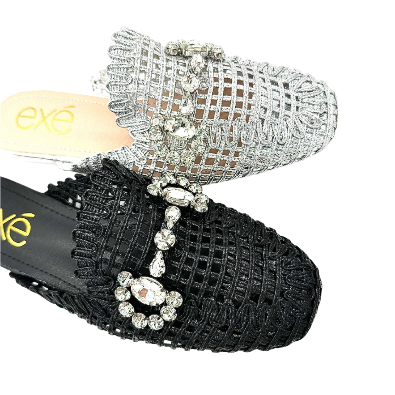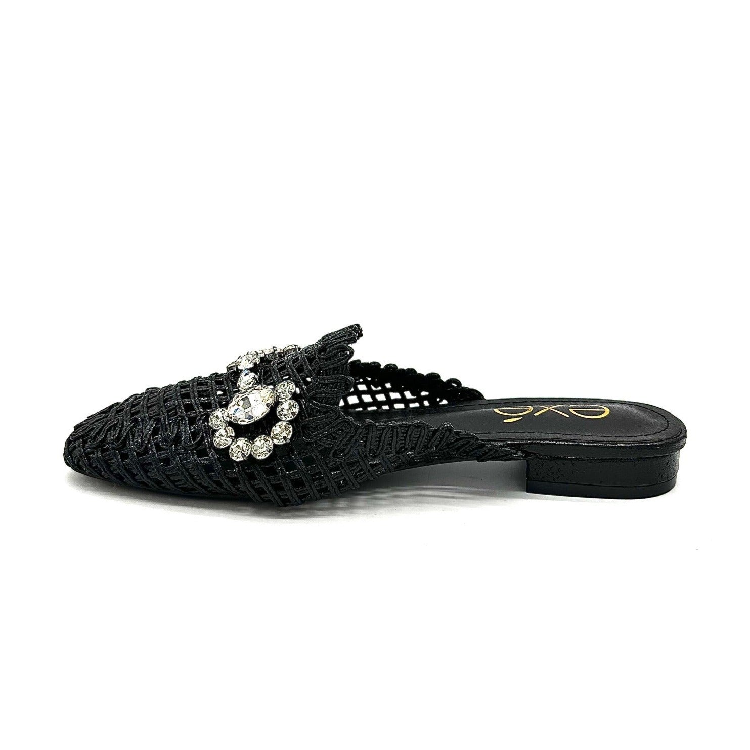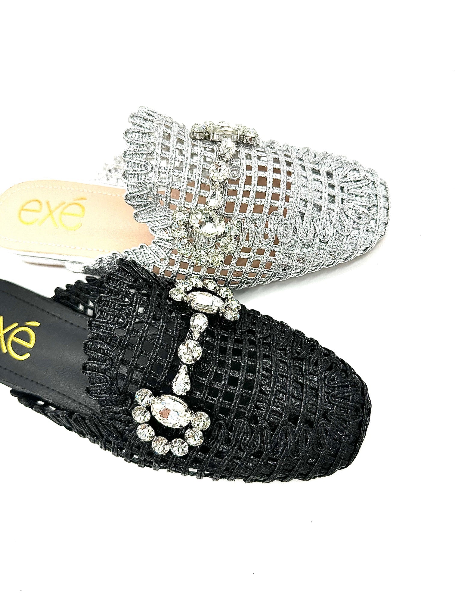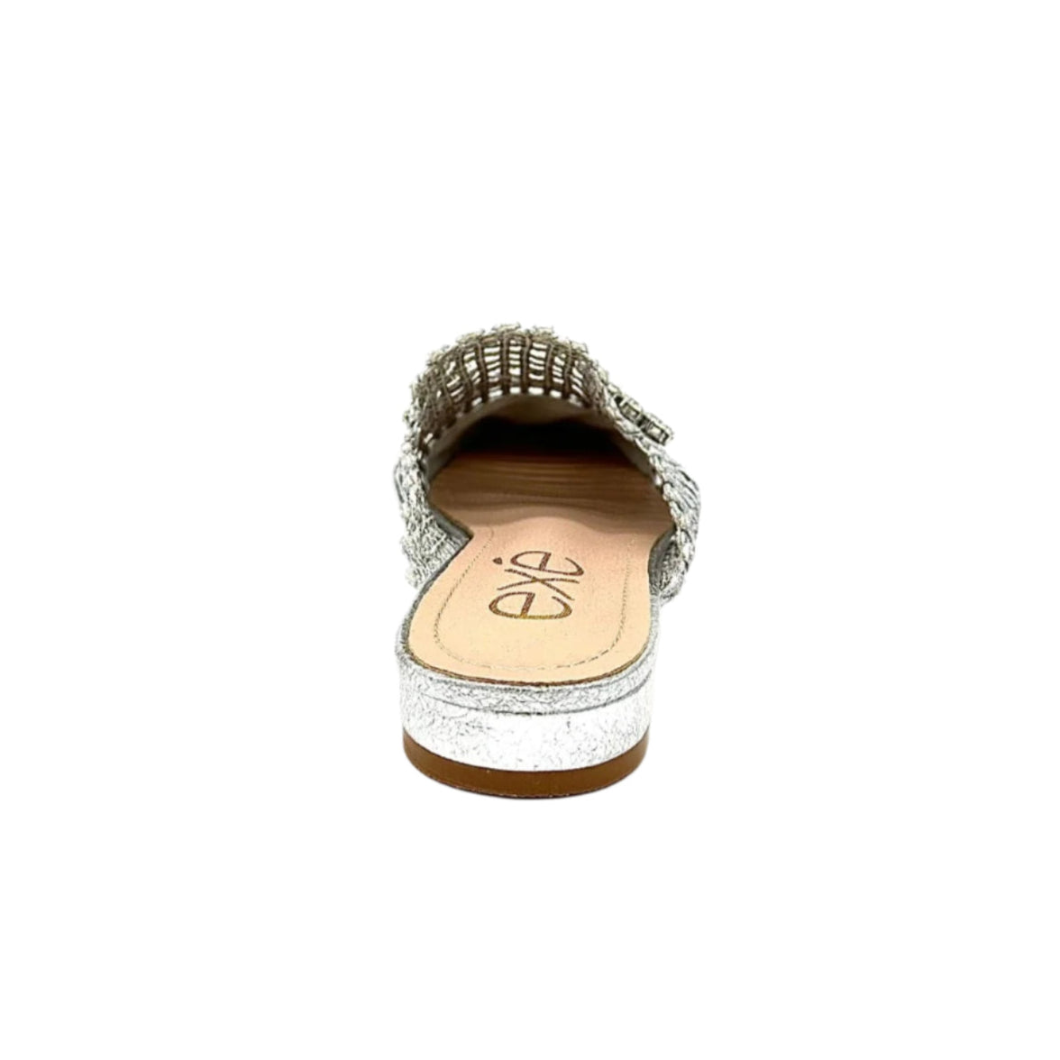 Add instant glamour to your look with the EXE 23008-A1 — a statement woven mule that blends elegance with everyday comfort. Featuring a glimmering lattice texture and topped with a crystal flower embellishment, this slip-on is designed to sparkle from every angle. Its lightly cushioned insole and low heel make it as comfortable as it is chic. Perfect for weddings, parties, or a night out, this mule brings effortless sophistication to any outfit.