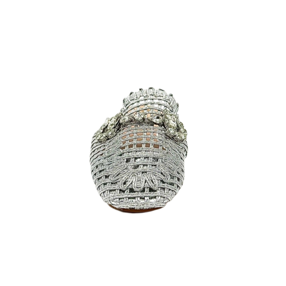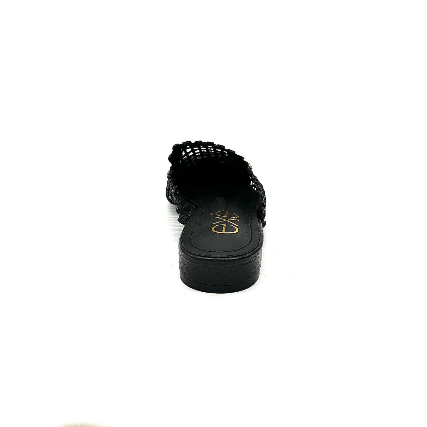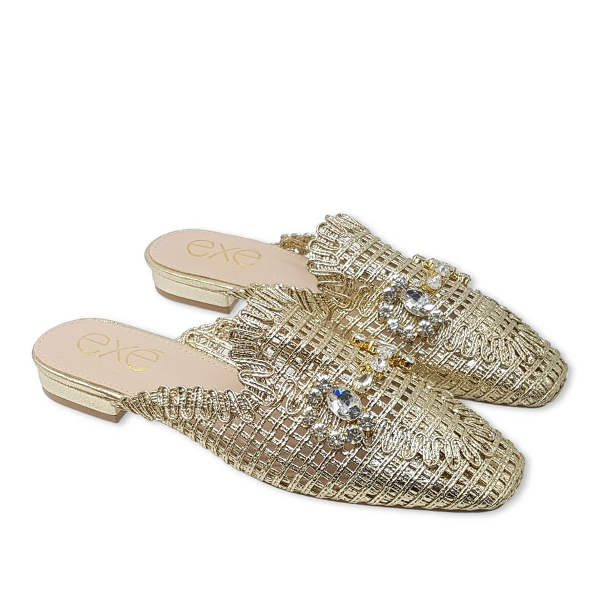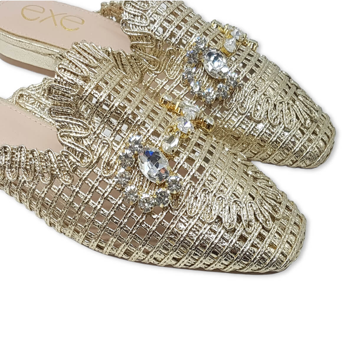 Add instant glamour to your look with the EXE 23008-A1 — a statement woven mule that blends elegance with everyday comfort. Featuring a glimmering lattice texture and topped with a crystal flower embellishment, this slip-on is designed to sparkle from every angle. Its lightly cushioned insole and low heel make it as comfortable as it is chic. Perfect for weddings, parties, or a night out, this mule brings effortless sophistication to any outfit.