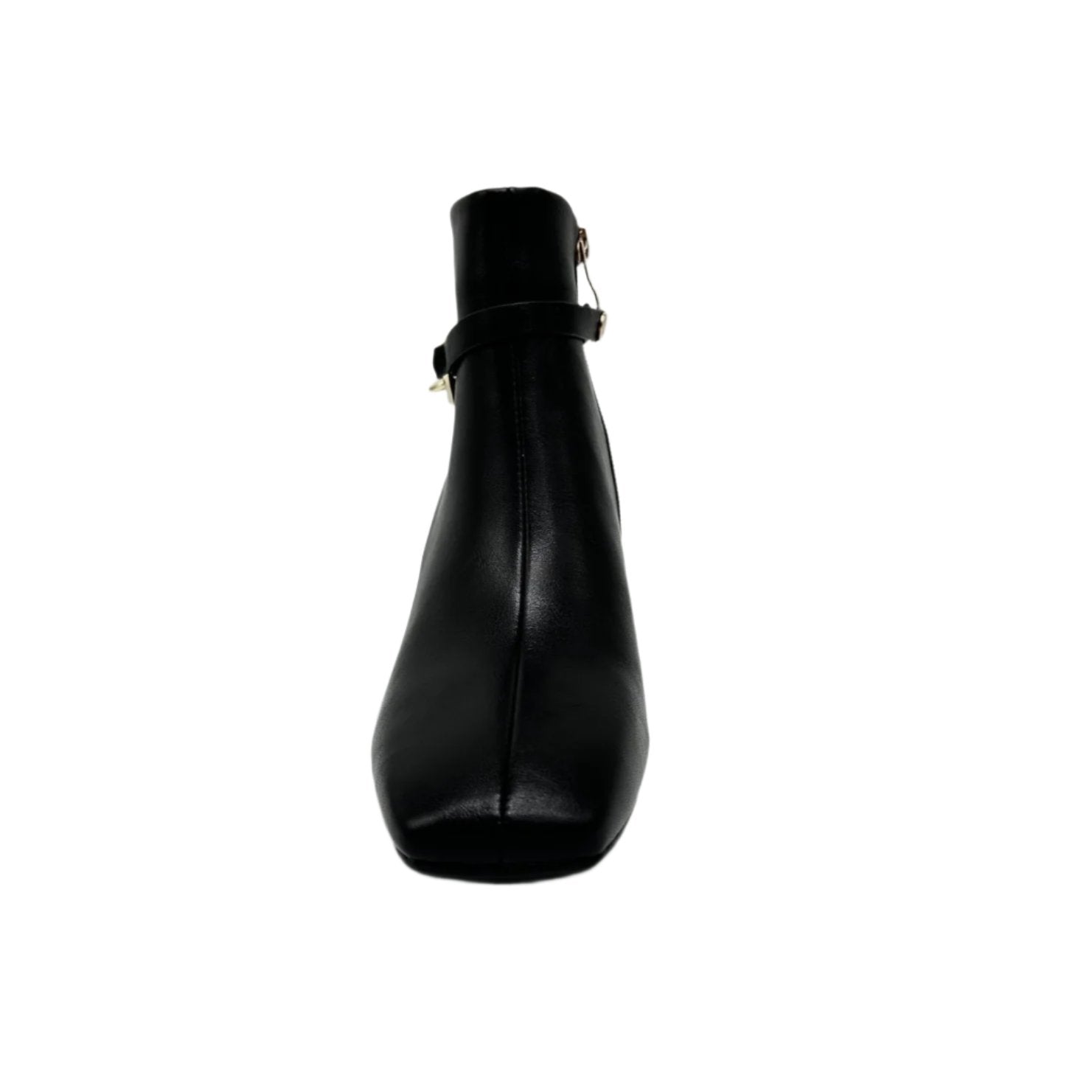 Chunk heel black leather bootie with gold chain and zipper on the side.
