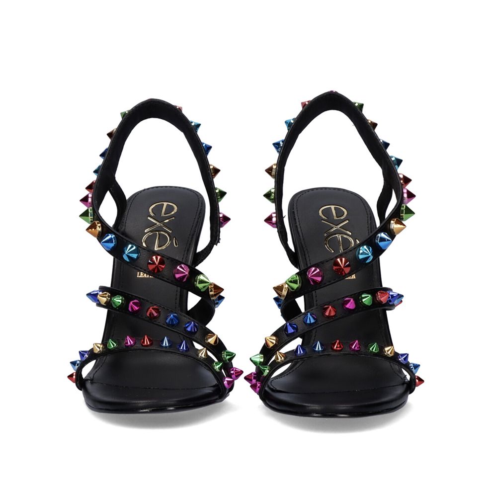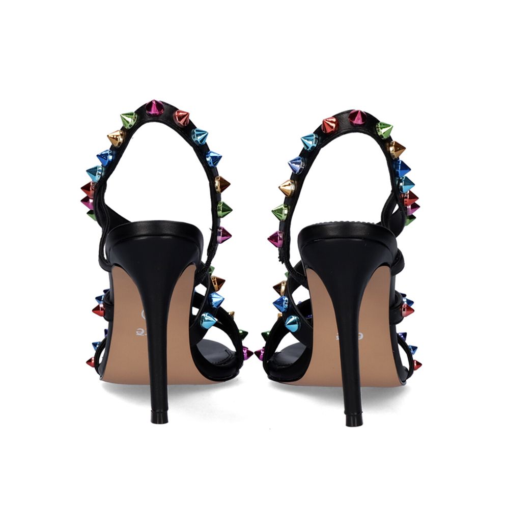 10 cm heel sandal in black with colored studs. Its upper and sole are made of synthetic material, the insole is made of leather