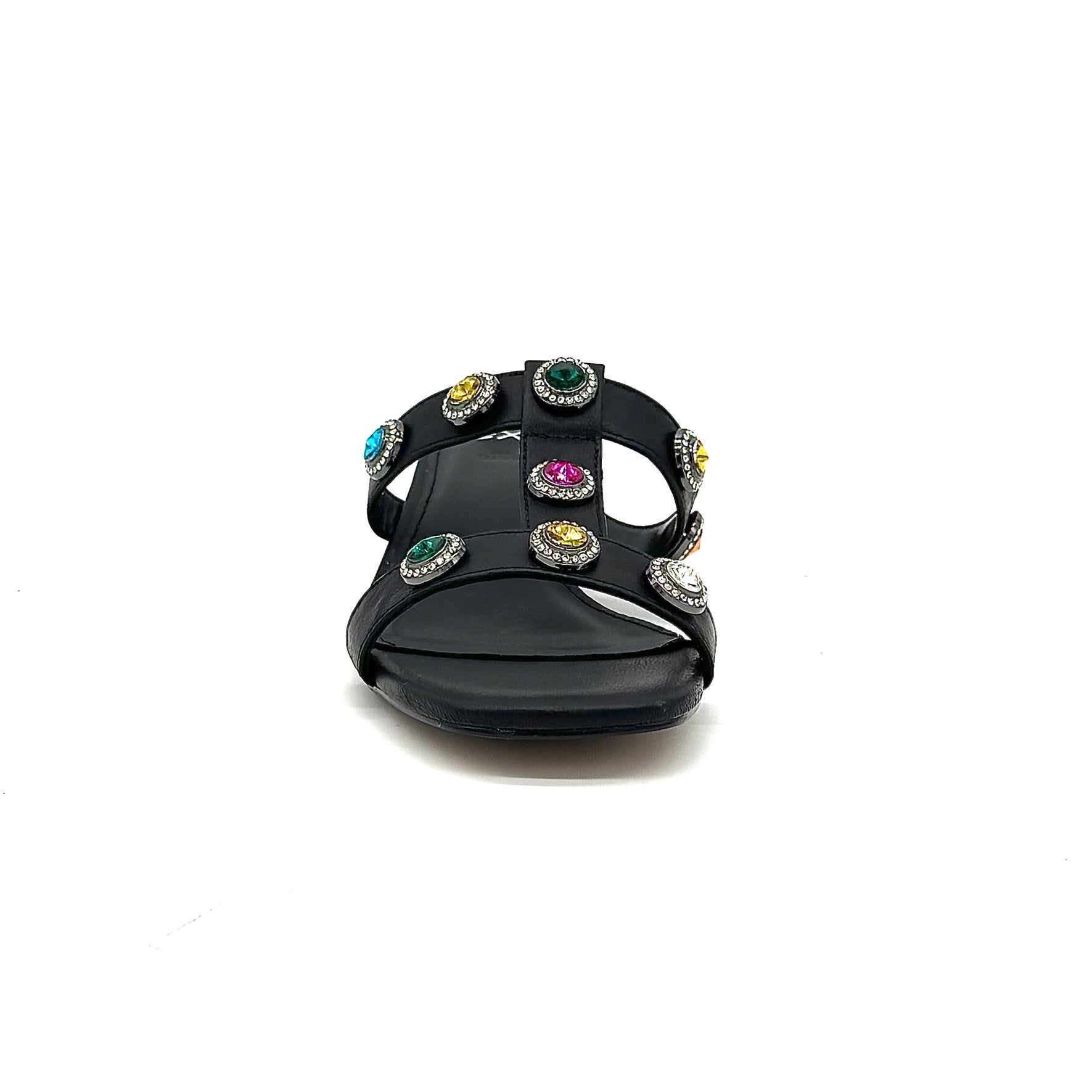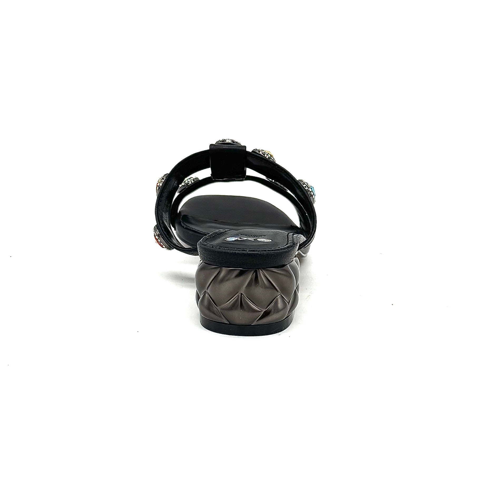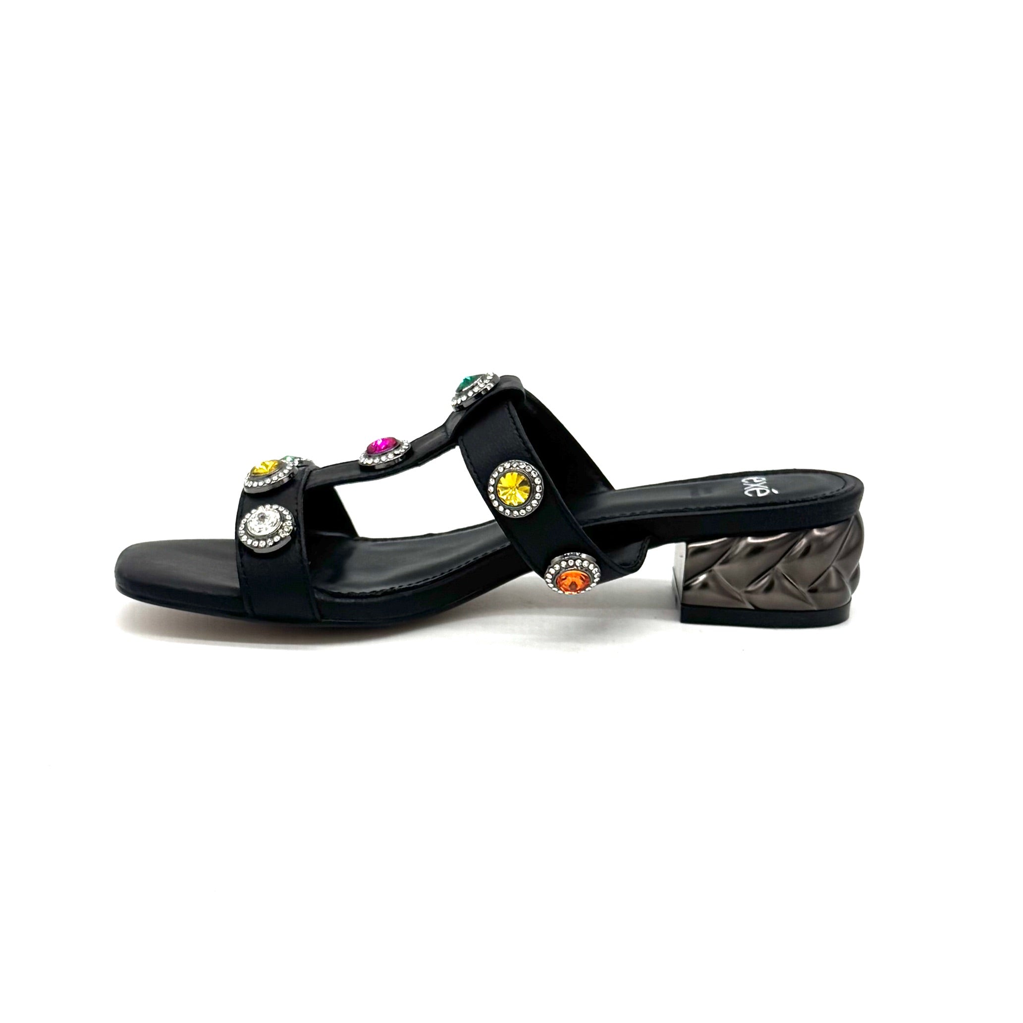 Elevate your style with the EXE Jeweled Slide Sandal, crafted for the perfect balance of comfort and glamour. Sleek straps adorned with vibrant multicolor gemstones bring a touch of sparkle to every step, while the metallic block heel adds a modern edge. A chic slip-on design makes it effortless for day-to-night wear.