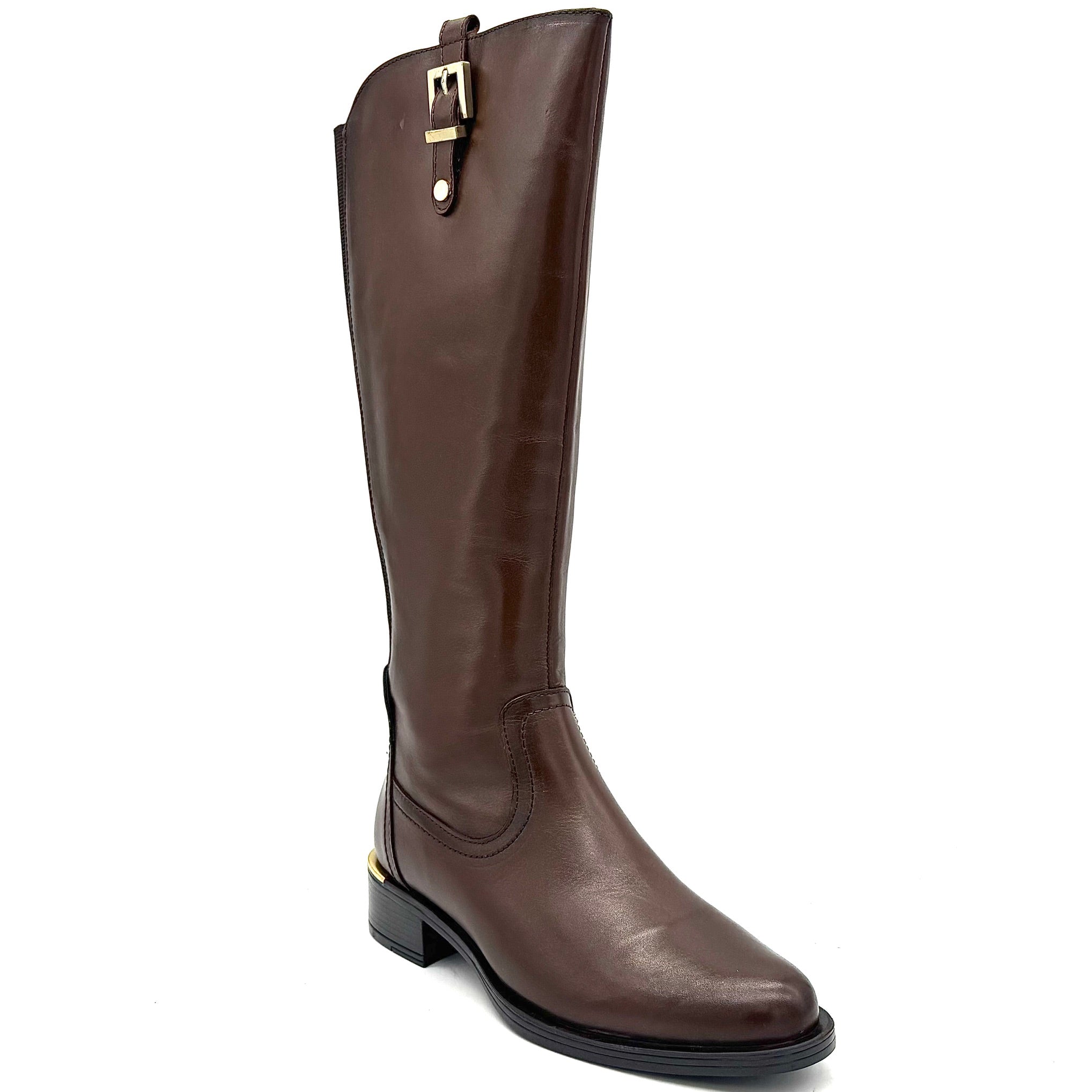 The Laura 2223 by EXE is a refined tall boot designed with a full leather outer and leather inner lining for lasting comfort and durability. Available in rich brown or sleek black, this knee-high boot features a decorative top buckle, elastic side panels for flexibility, and a low block heel with gold trim. Imported and versatile, it’s a timeless style that pairs effortlessly with jeans, skirts, or dresses.