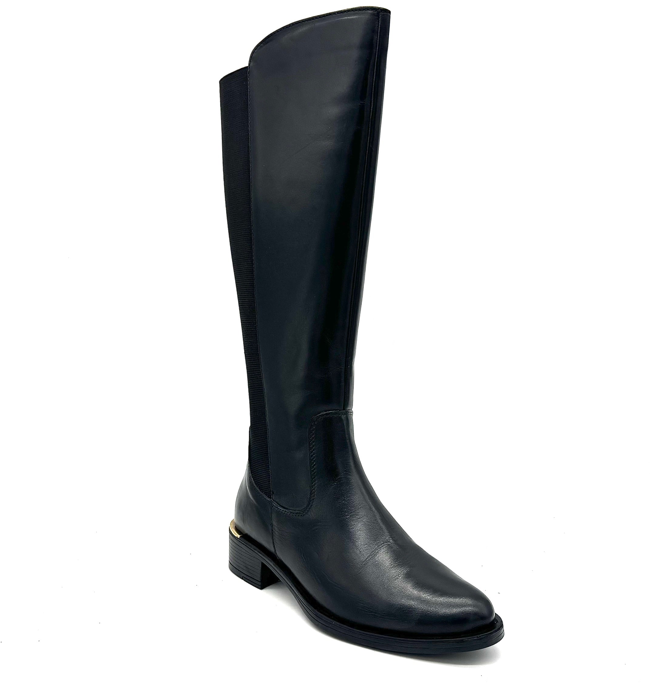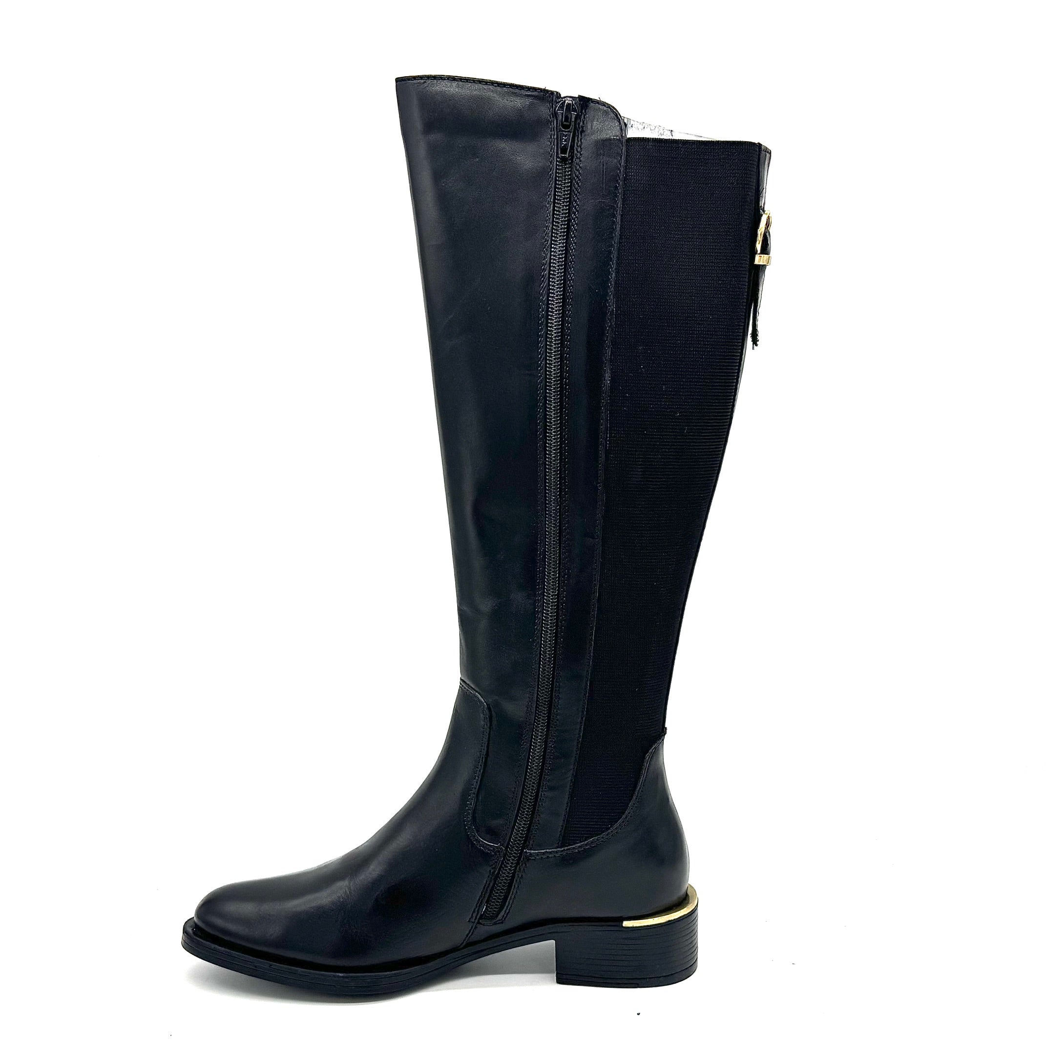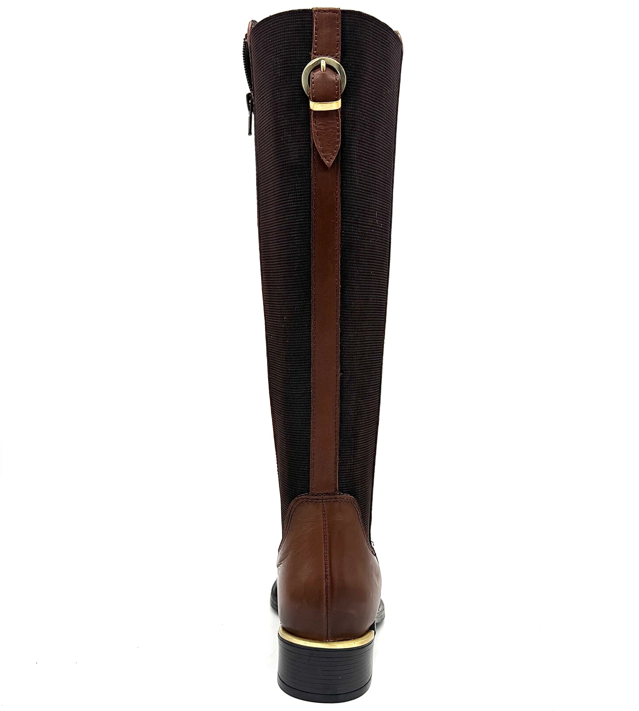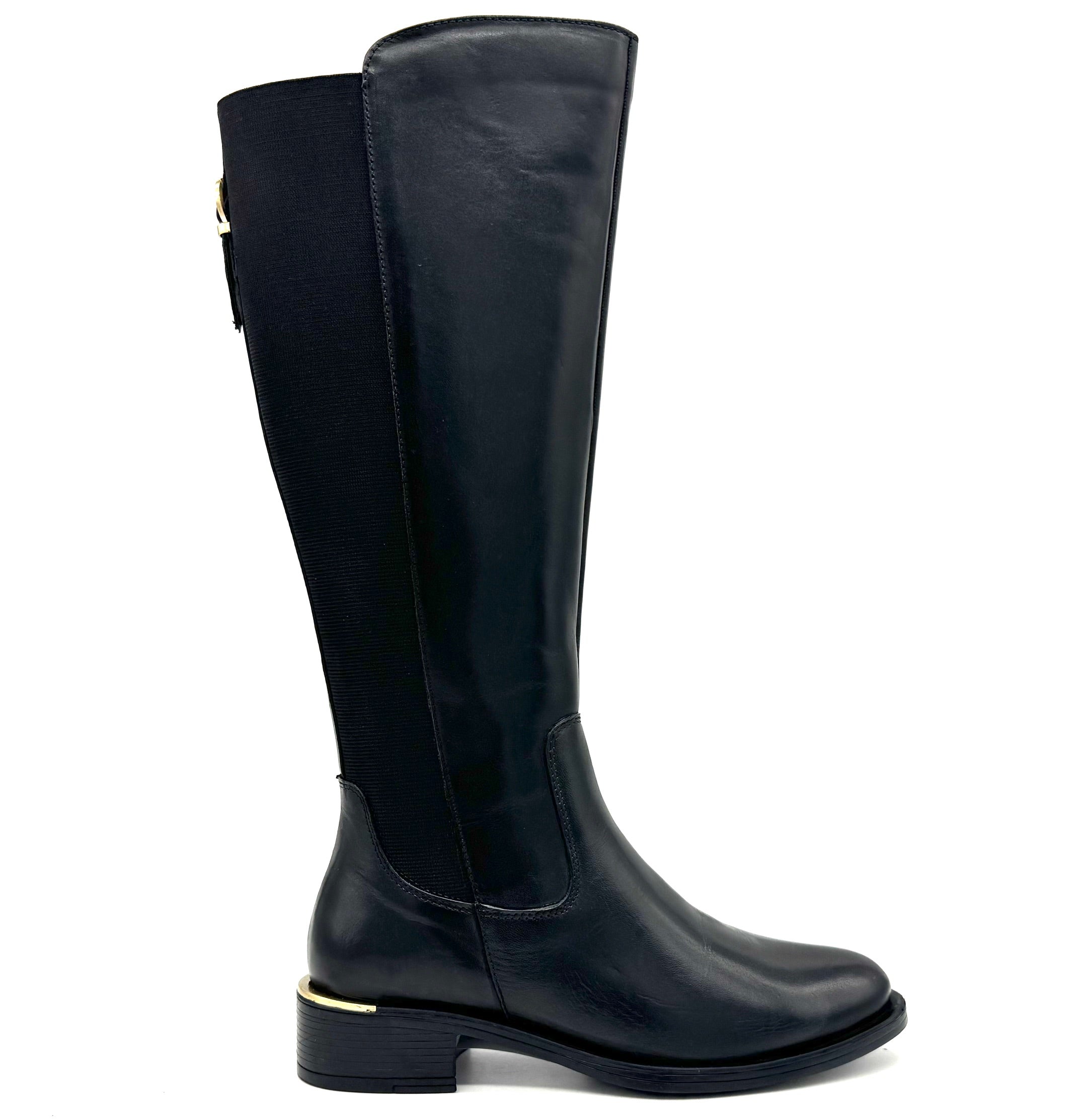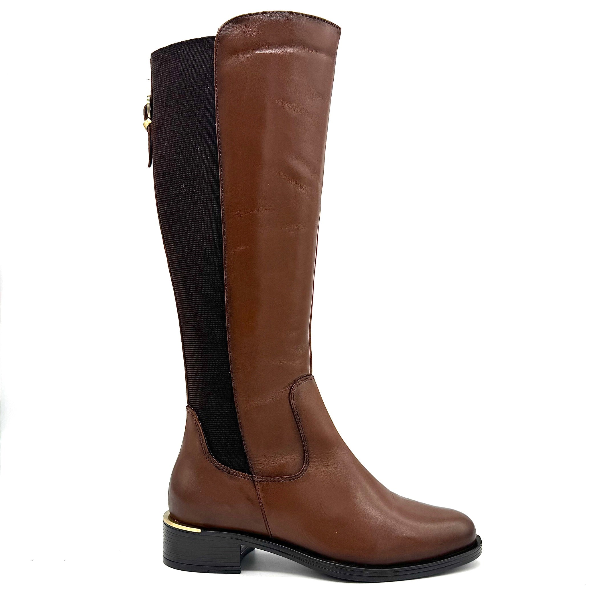 The Laura 2412 by EXE is an elegant tall boot crafted with a full leather outer and leather inner lining for long-lasting comfort and quality. Available in both brown and black, this knee-high boot features sleek elastic side panels for flexibility, a low block heel with gold trim, and a timeless silhouette that elevates any outfit. Imported and versatile, it’s the perfect go-to style for pairing with jeans, skirts, or dresses throughout the season.