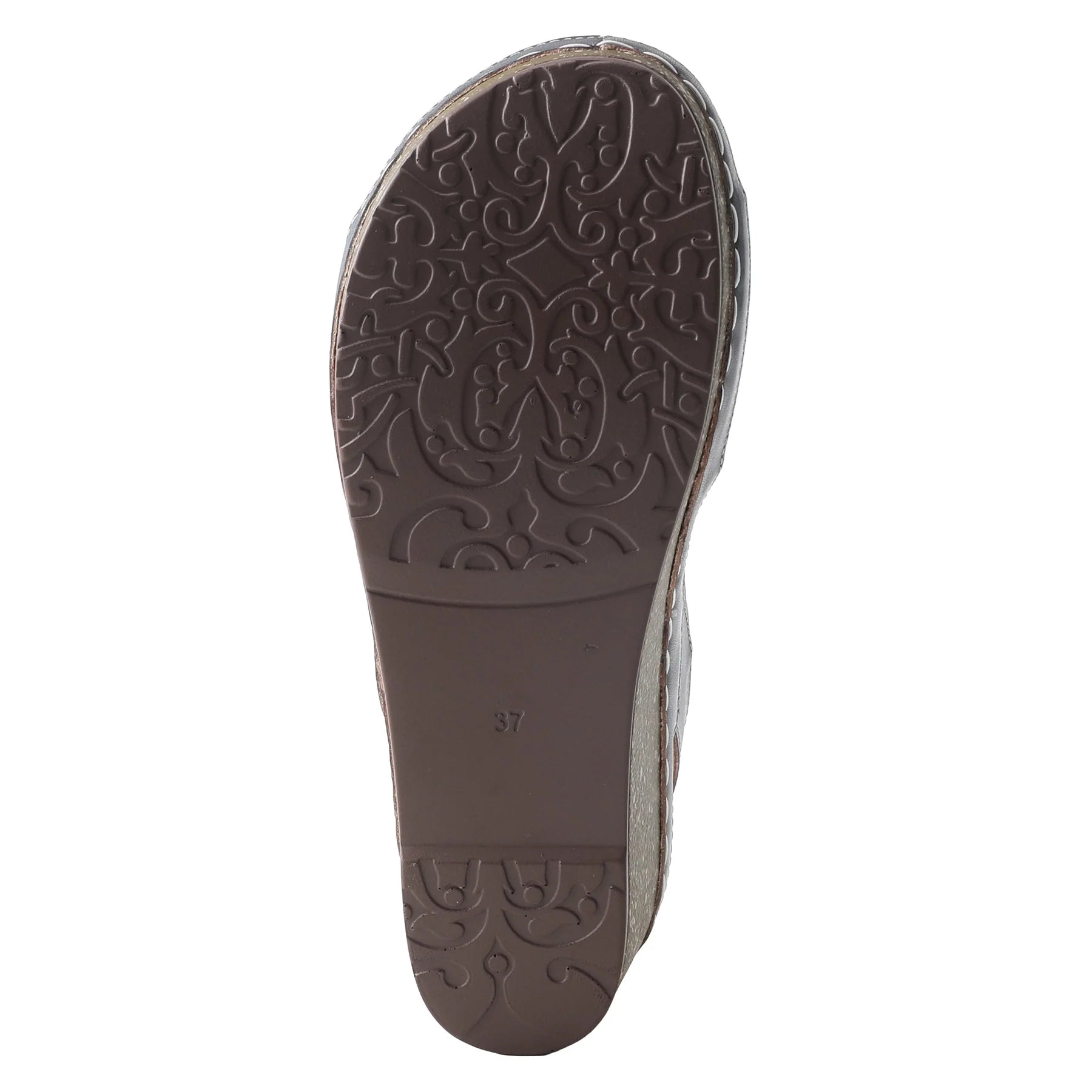 Fashion and leisure. This leather sandal was made for both. The embossed floral pattern, lattice work at the top and braided asymmetrical side strap with an antiqued flower gives it a rich combination of details. The Hook and Loop Velcro closure and padded back strap make for a secure and comfortable fit. Perfect for an active day or to just kick your feet up and relax.