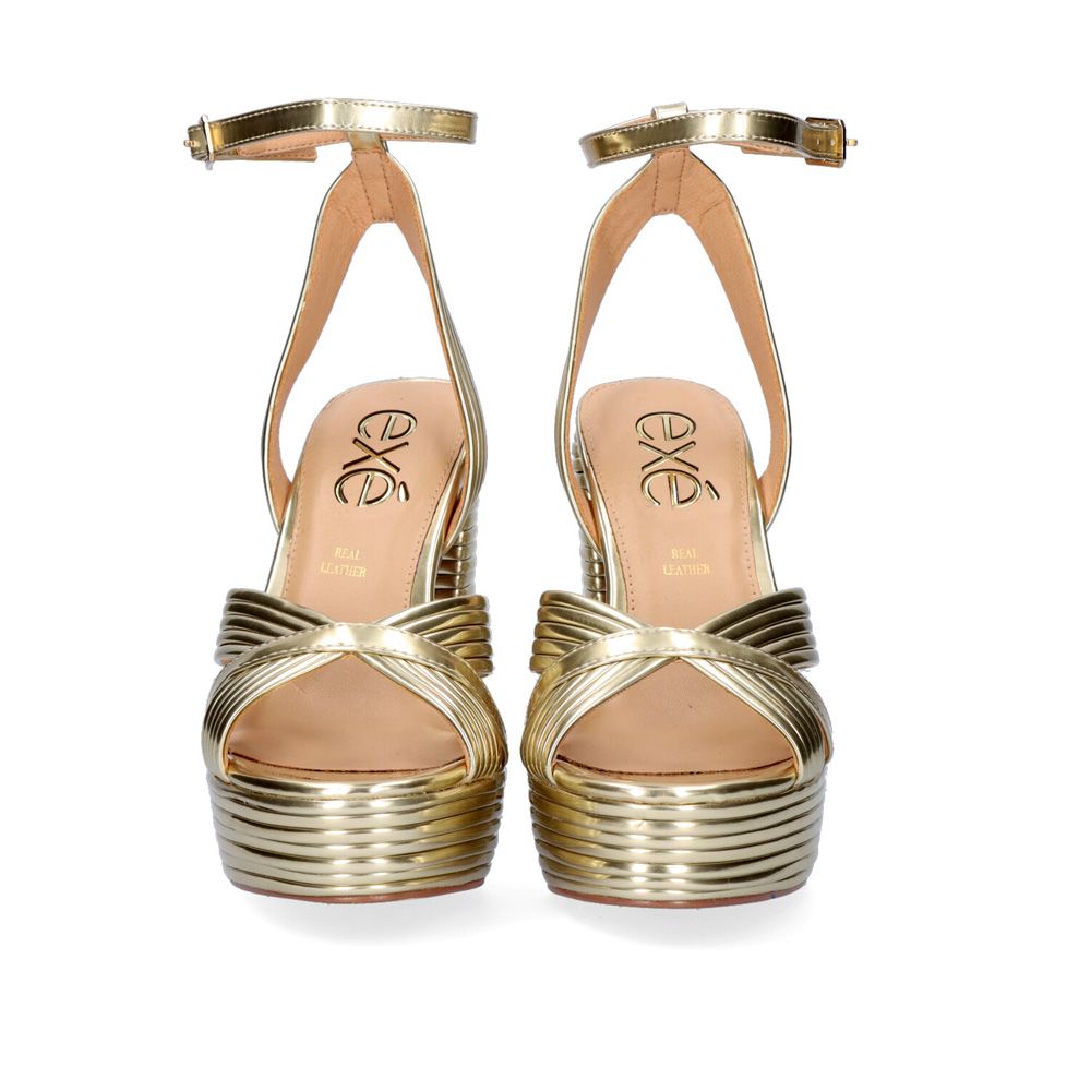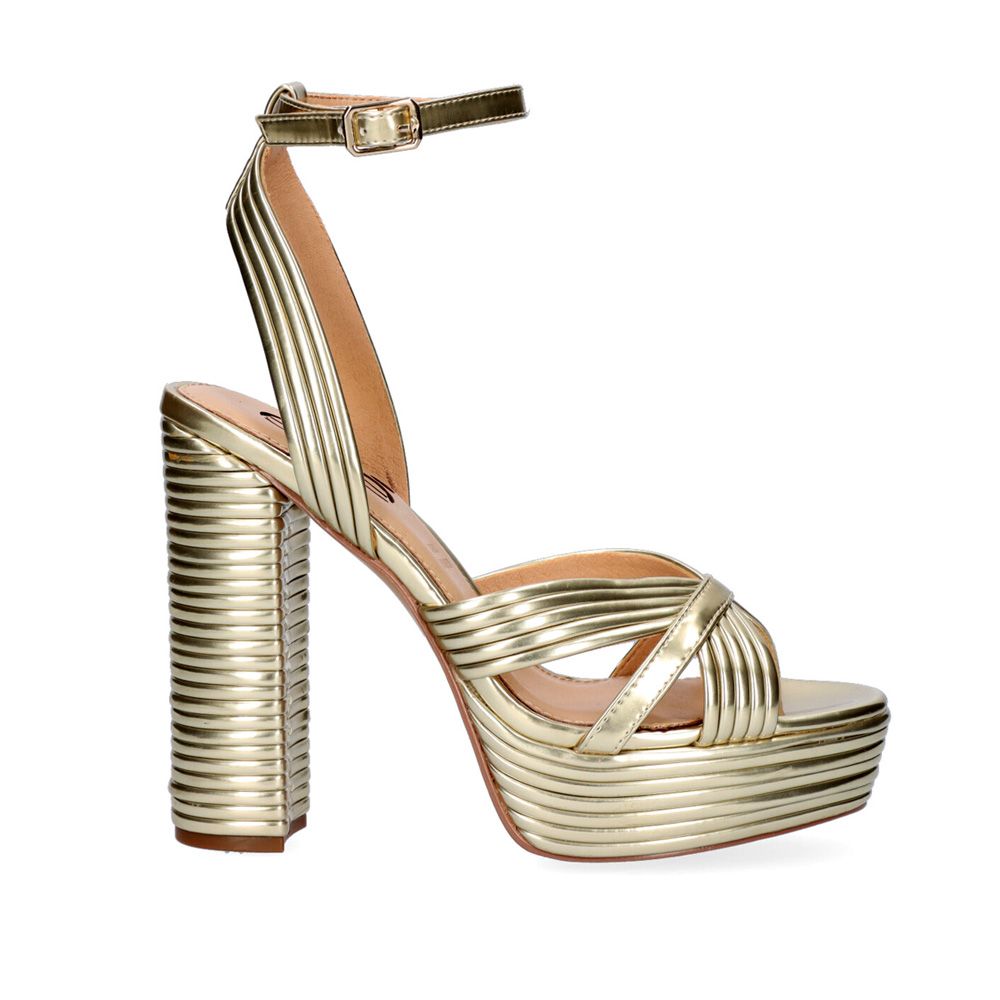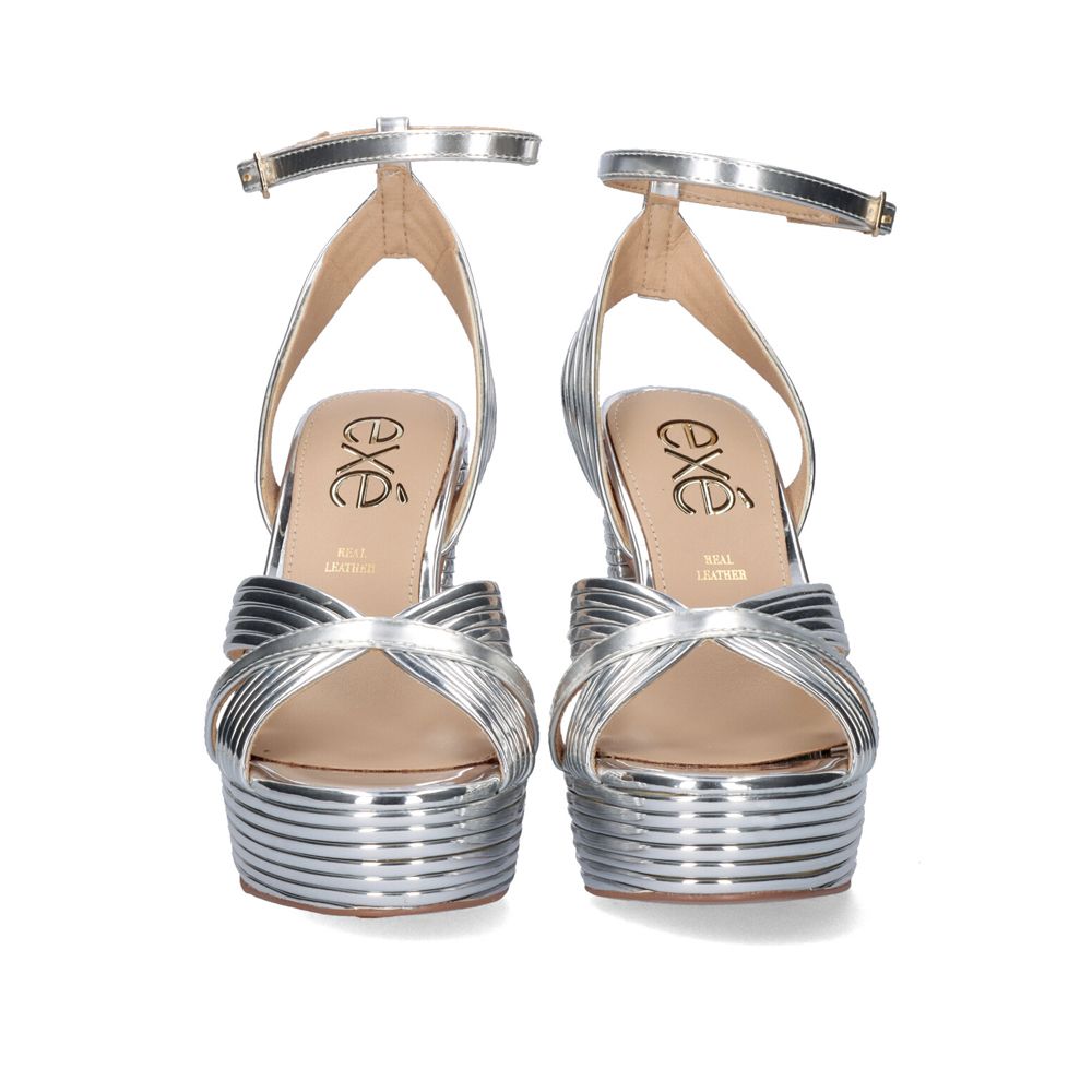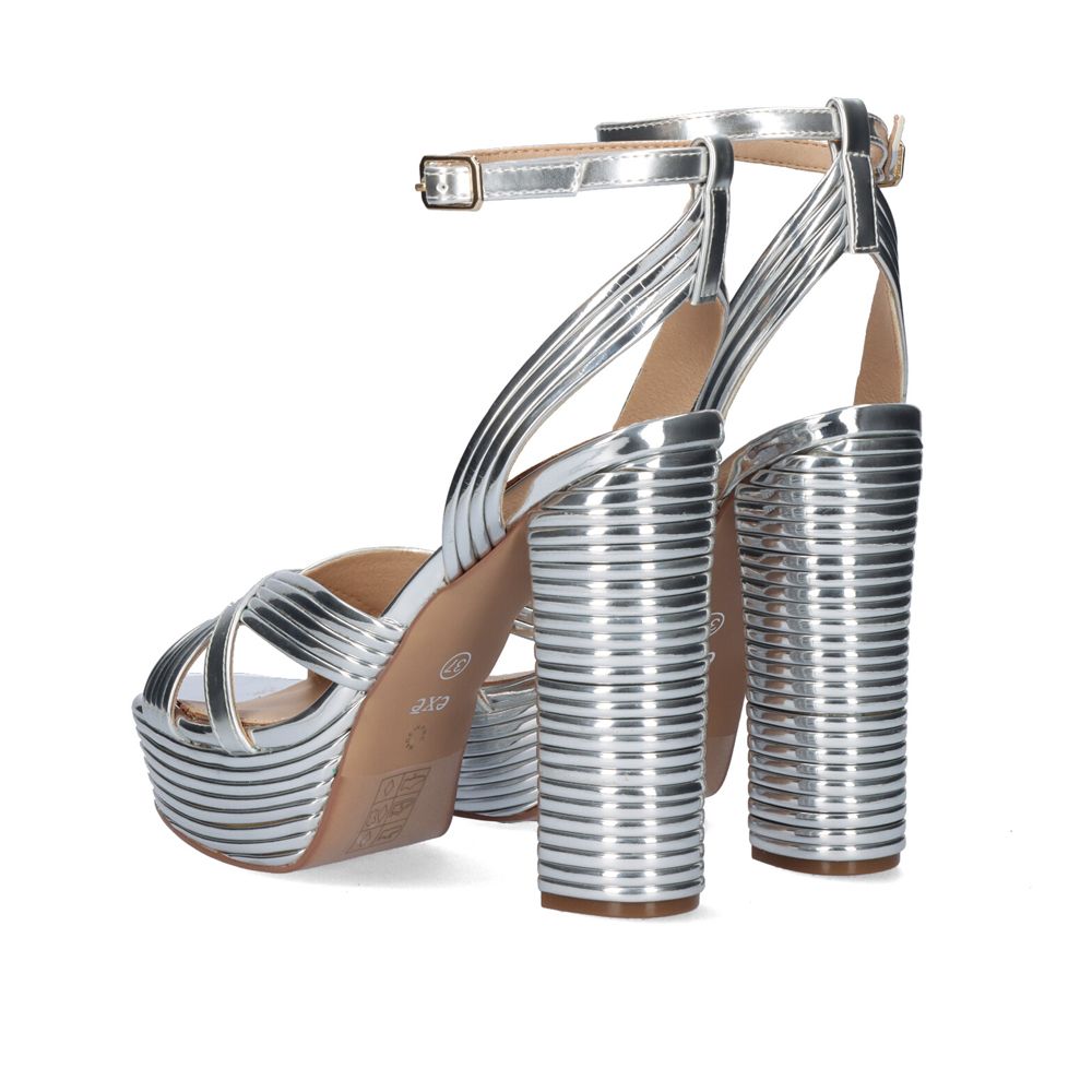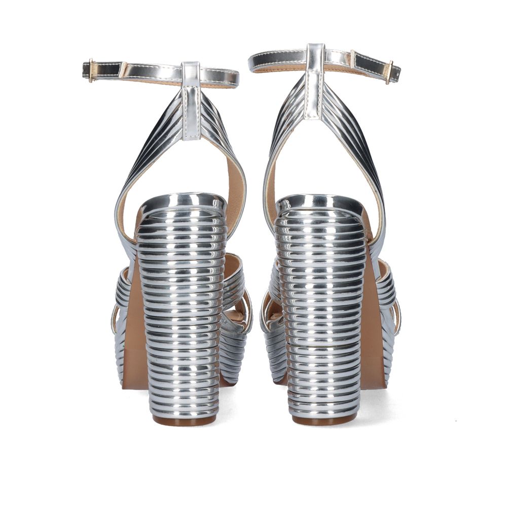 High-heeled and platform sandals lined with silver textile straps. The front strip is made up of the same heel strips as the heel support. It has a ribbon on the ankle that takes the buckle closure to the ankle. Heel height of 12 cm and platform of 4 cm.